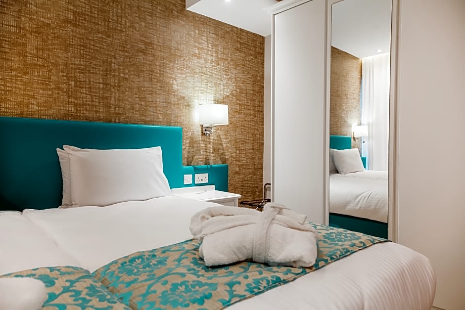 DELUXE 2-BEDROOM APARTMENT SEAVIEW is 431 square feet and includes 2 single beds 80-130 width plus satellite tv , hairdryer, tea and coffee making facilities , ironing set, safe, and bathrobes.