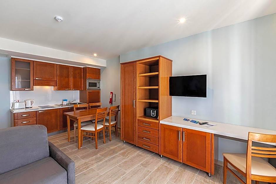 DELUXE STUDIO APARTMENT SEAVIEW is 269 square feet and includes either 2 single beds 80-130 width or a double bed 131-150 width plus a sofa bed plus extra beds on demand, satellite tv , hairdryer, tea and coffee making facilities , ironing set, safe, and bathrobes.